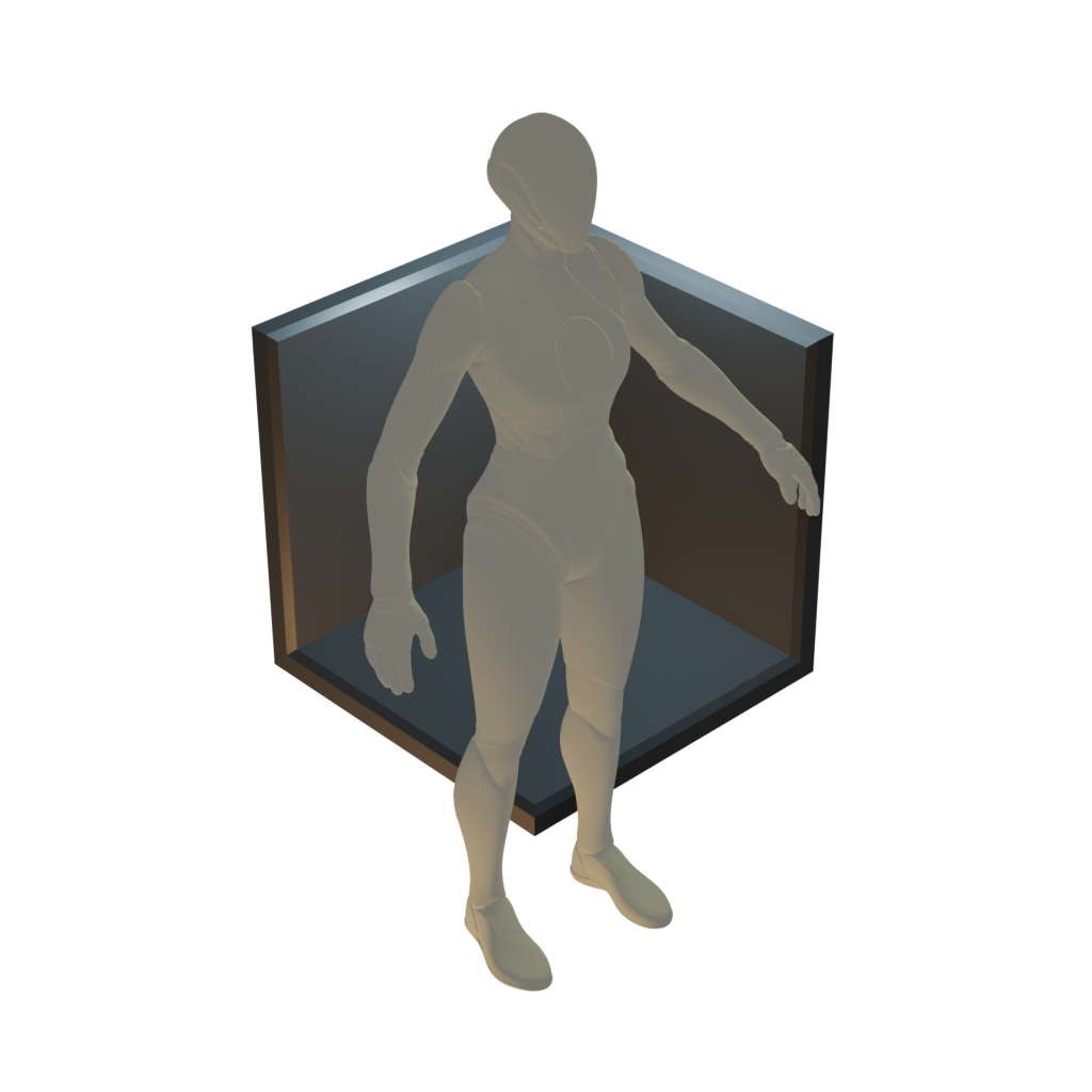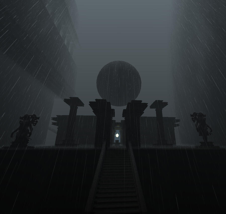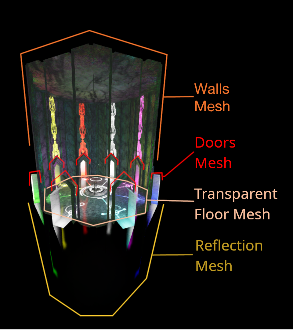 The Hub level is a single room that hold the doors to all the actual playable puzzle levles. The room is composed of 4 meshes, namely a walls mesh, a transparent floor mesh, a reflections mesh below it and a doors mesh. The doors get activated as certain number of puzzles get solved in each level. This is done sequentially so lighting in the room changes as the glowing doors get activated. For this several lightmap textures had to be baked and the materials had to be synced with the game advancement to reflect correctly the unlocked levels.