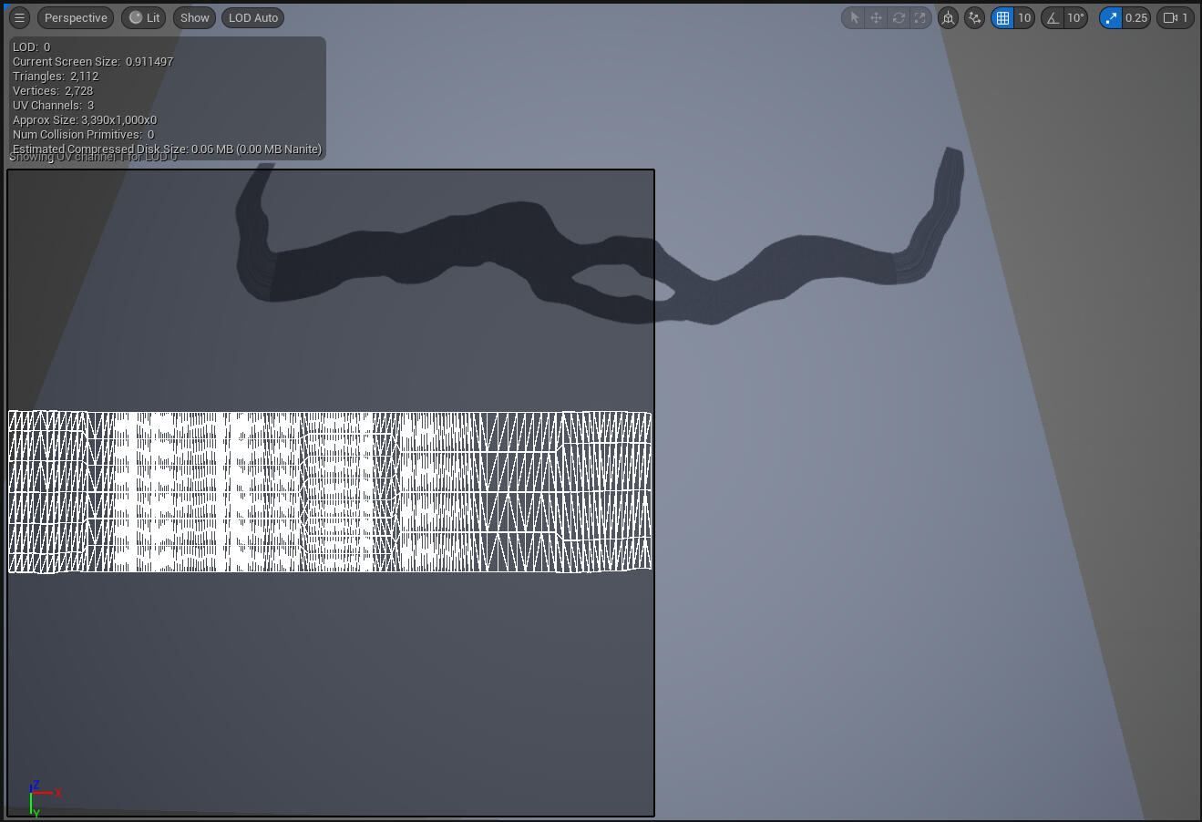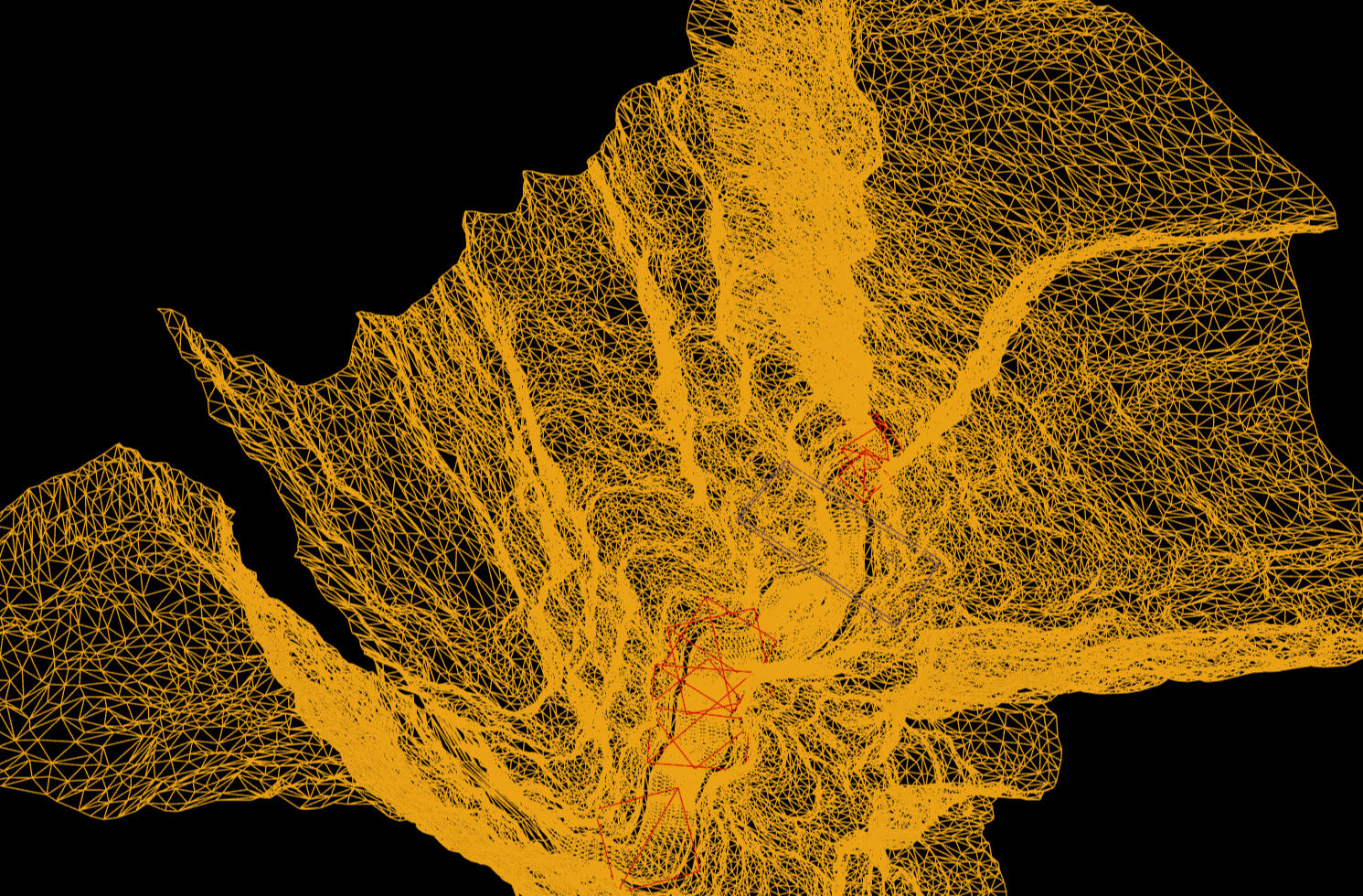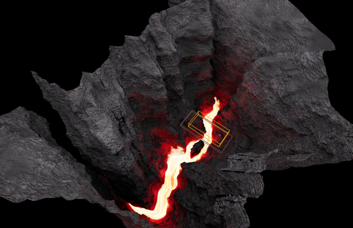 Montag planet level was made just as simple canyon of black volcanic rock with a lava river flowing below. The scene has a very simple construction that comprises the canyon mesh itself, a lava river mesh, a sky sphere and a couple of smoke particle systems. The main canyon texture was baked also from its twin scene in blender. The Canyon mesh could be made fairly high poly count thanks to the simplcitiy of the scene and the large breathing room the usage of extremely cheap rendering gave us performance-wise. This allowed for making it more interesting visually.